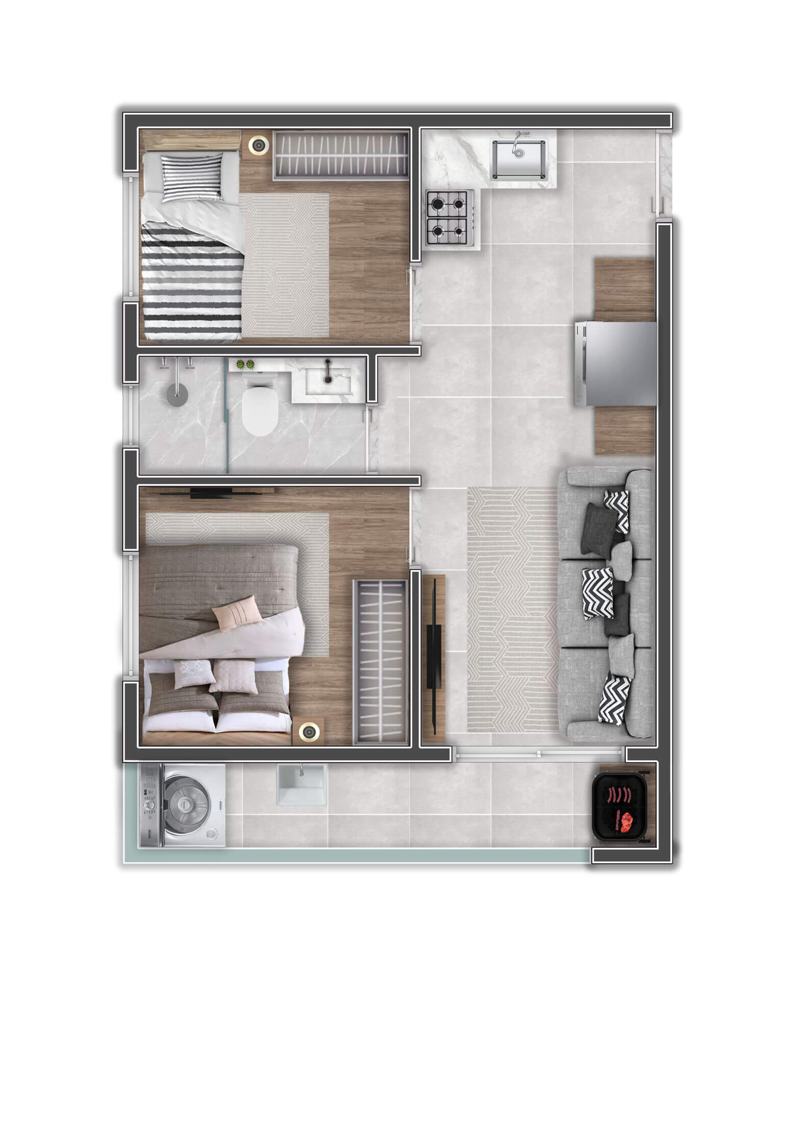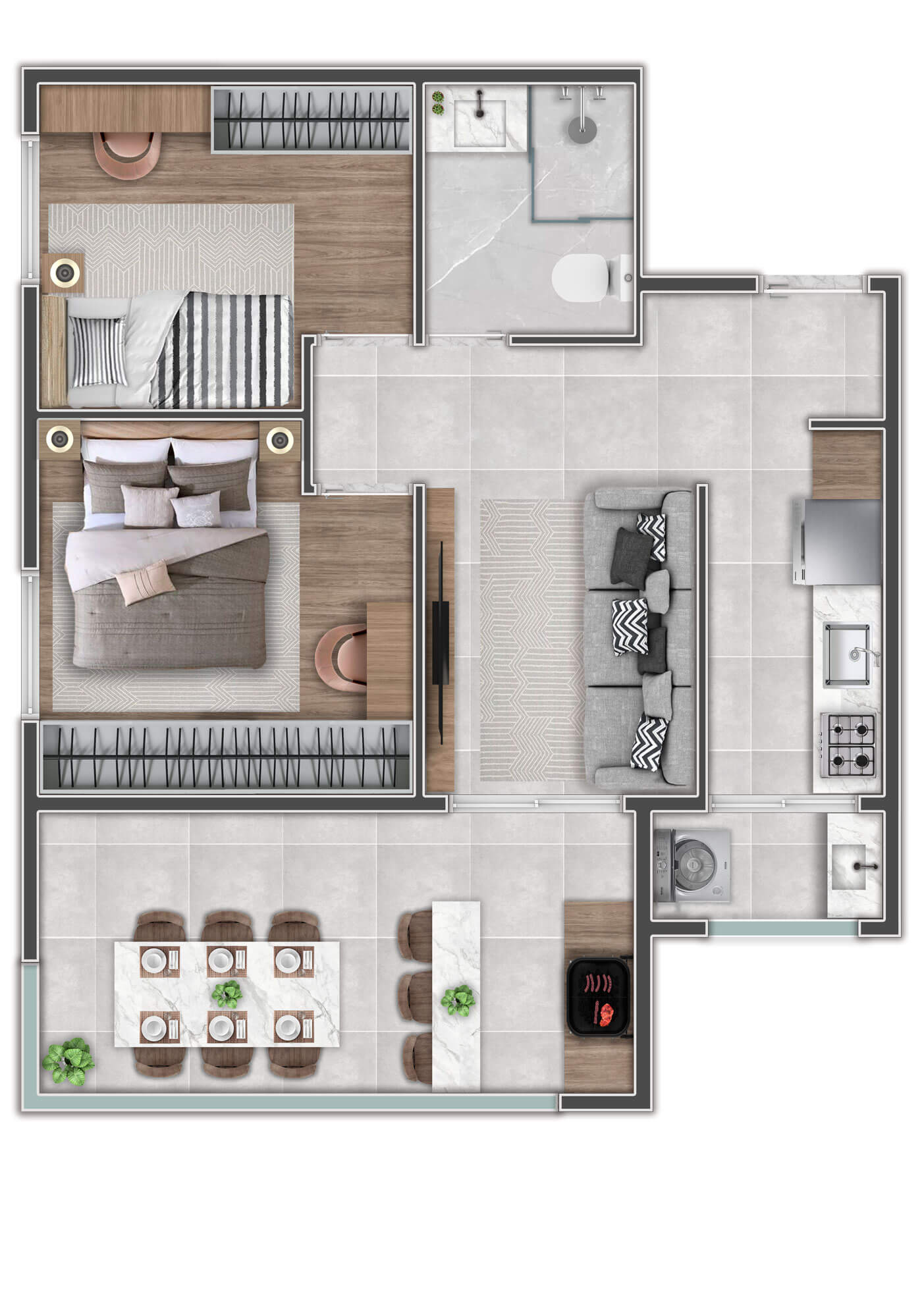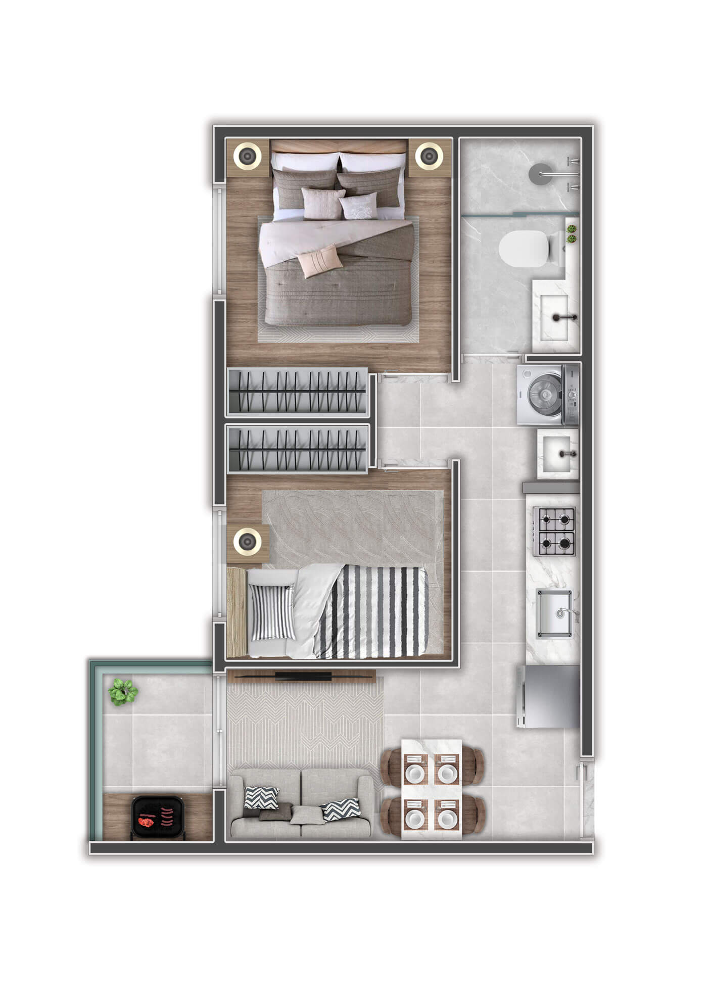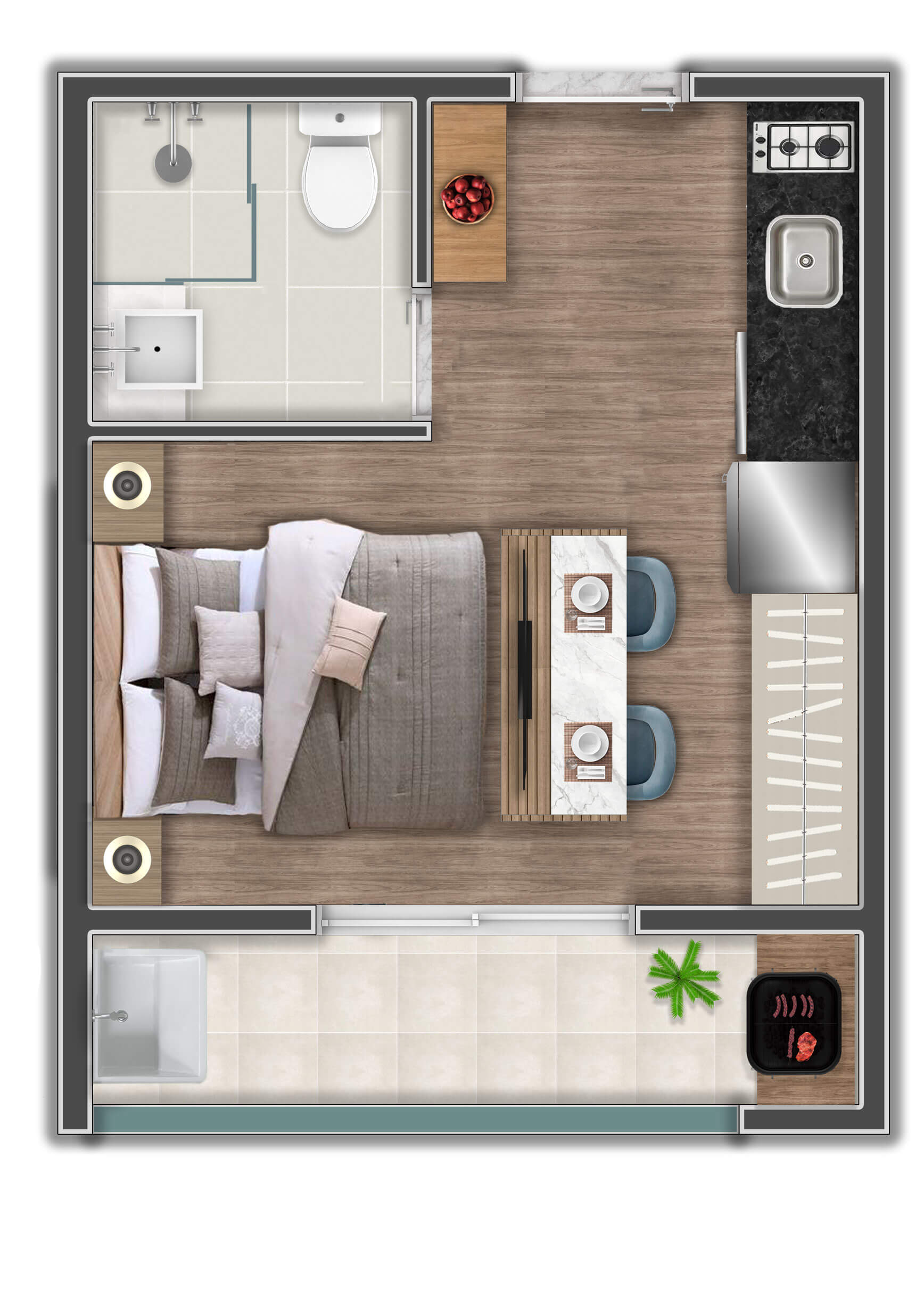 A decoração é mera sugestão. Mobiliários, utensílios e equipamentos, não fazem parte do contrato de compra e venda. Acabamentos e revestimentos serão entregues conforme memorial descritivo , disponível em nossa central de vendas