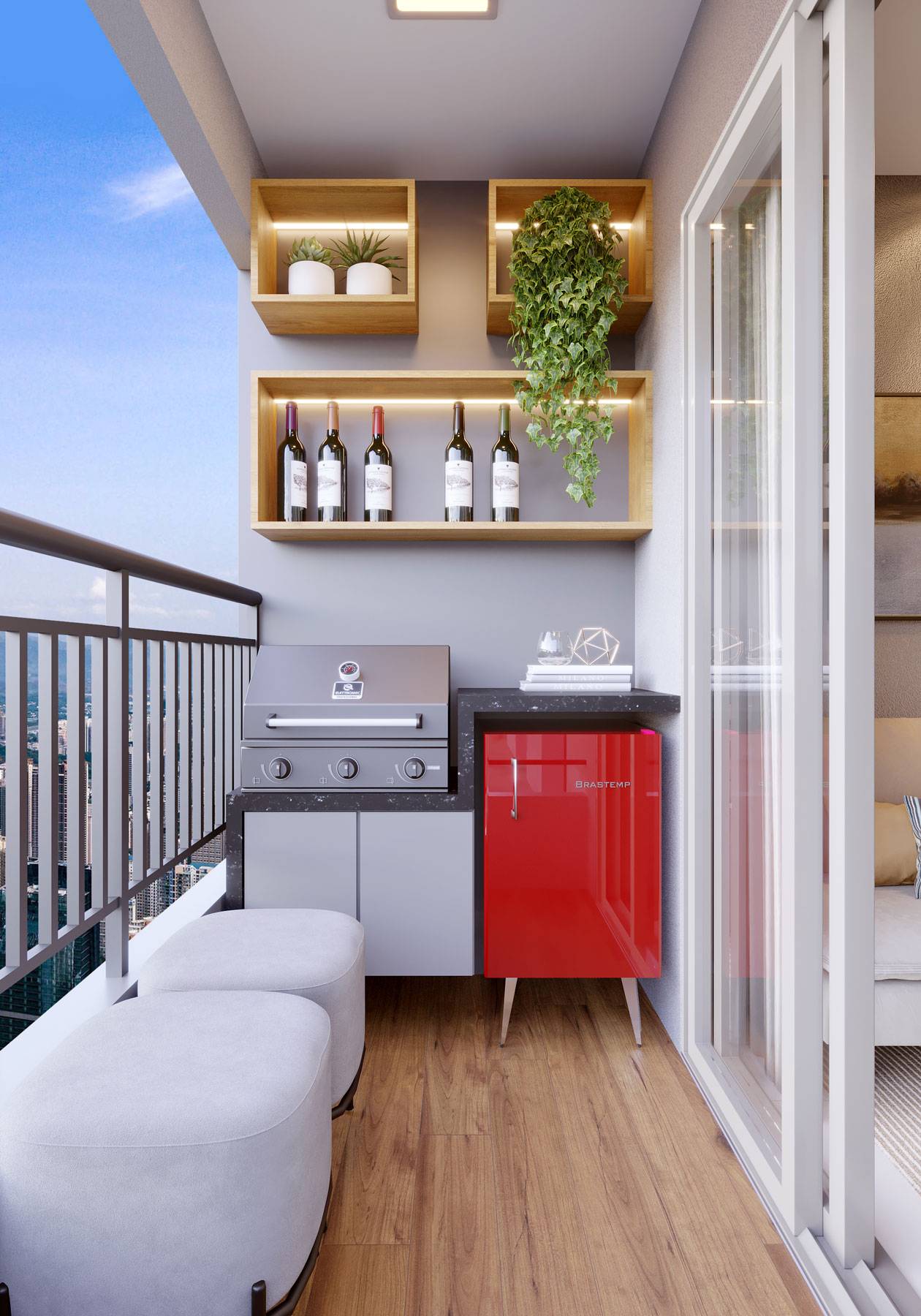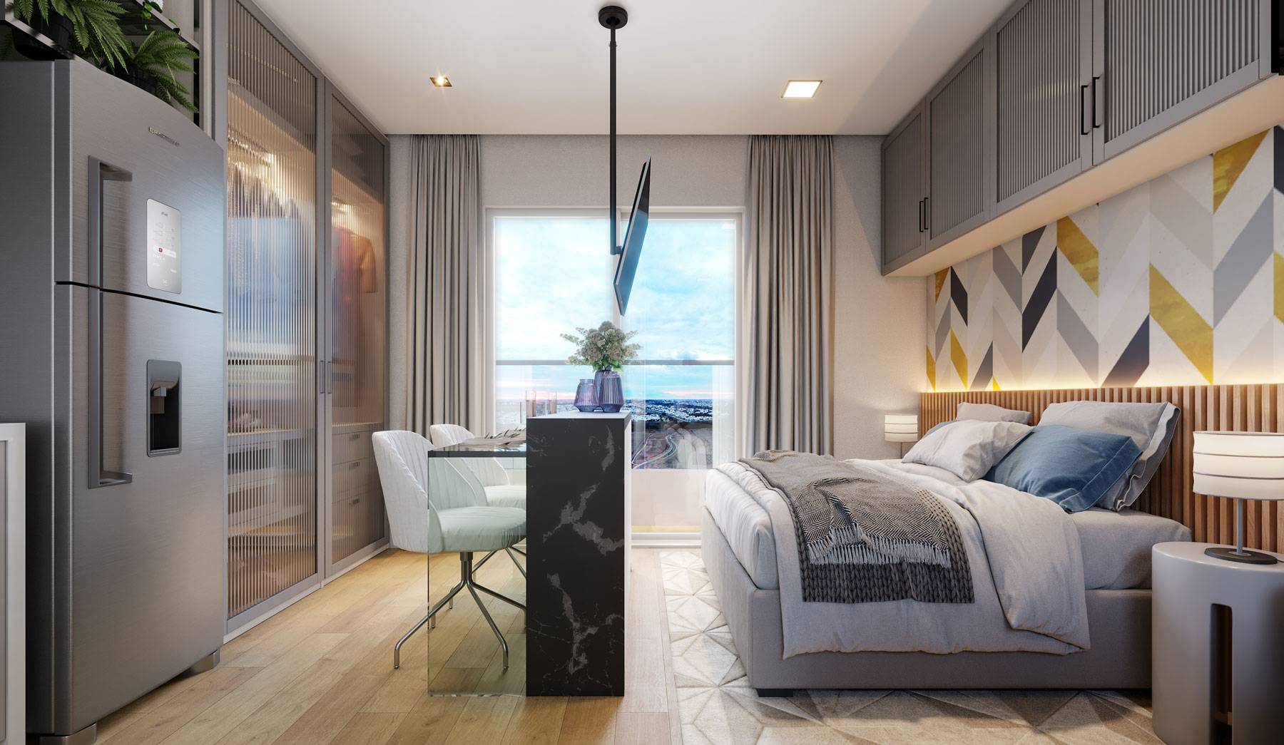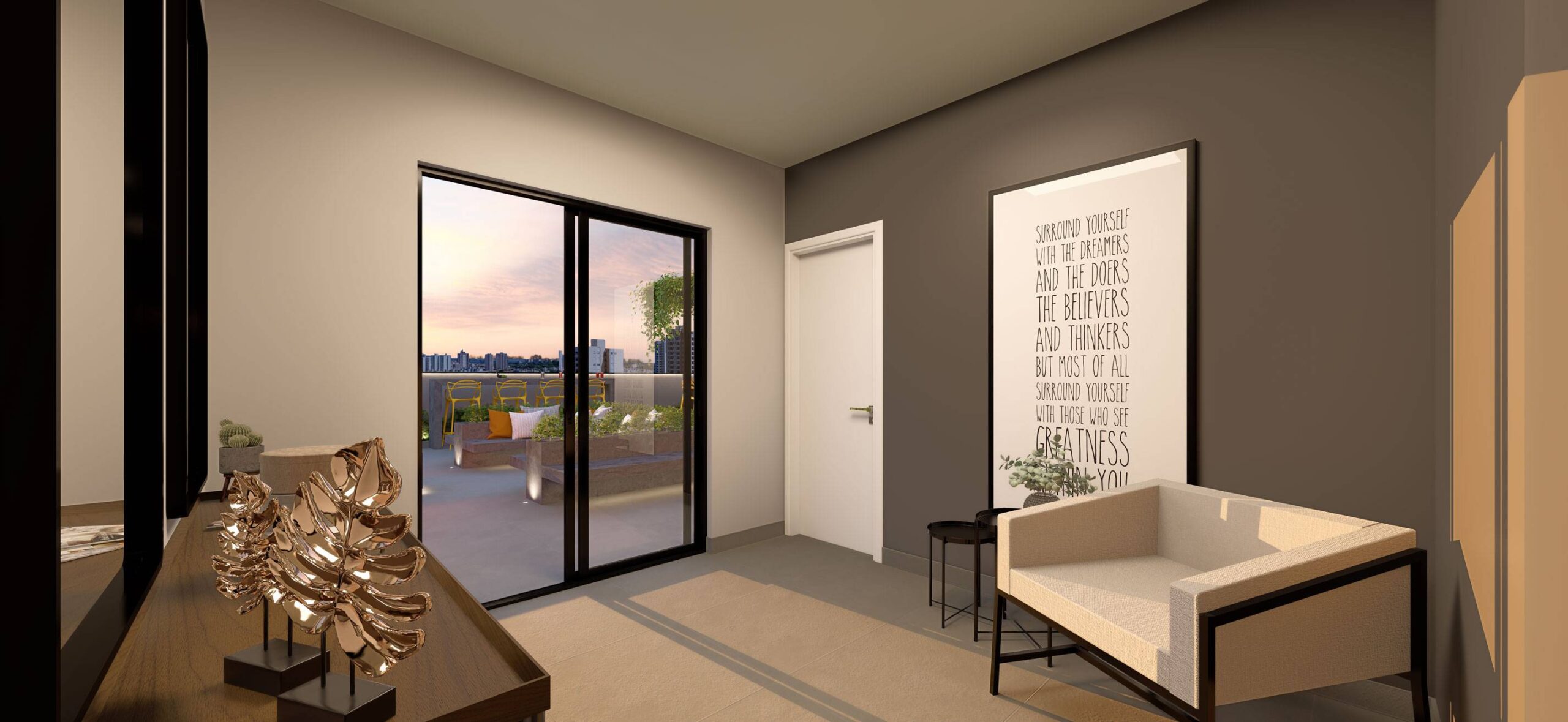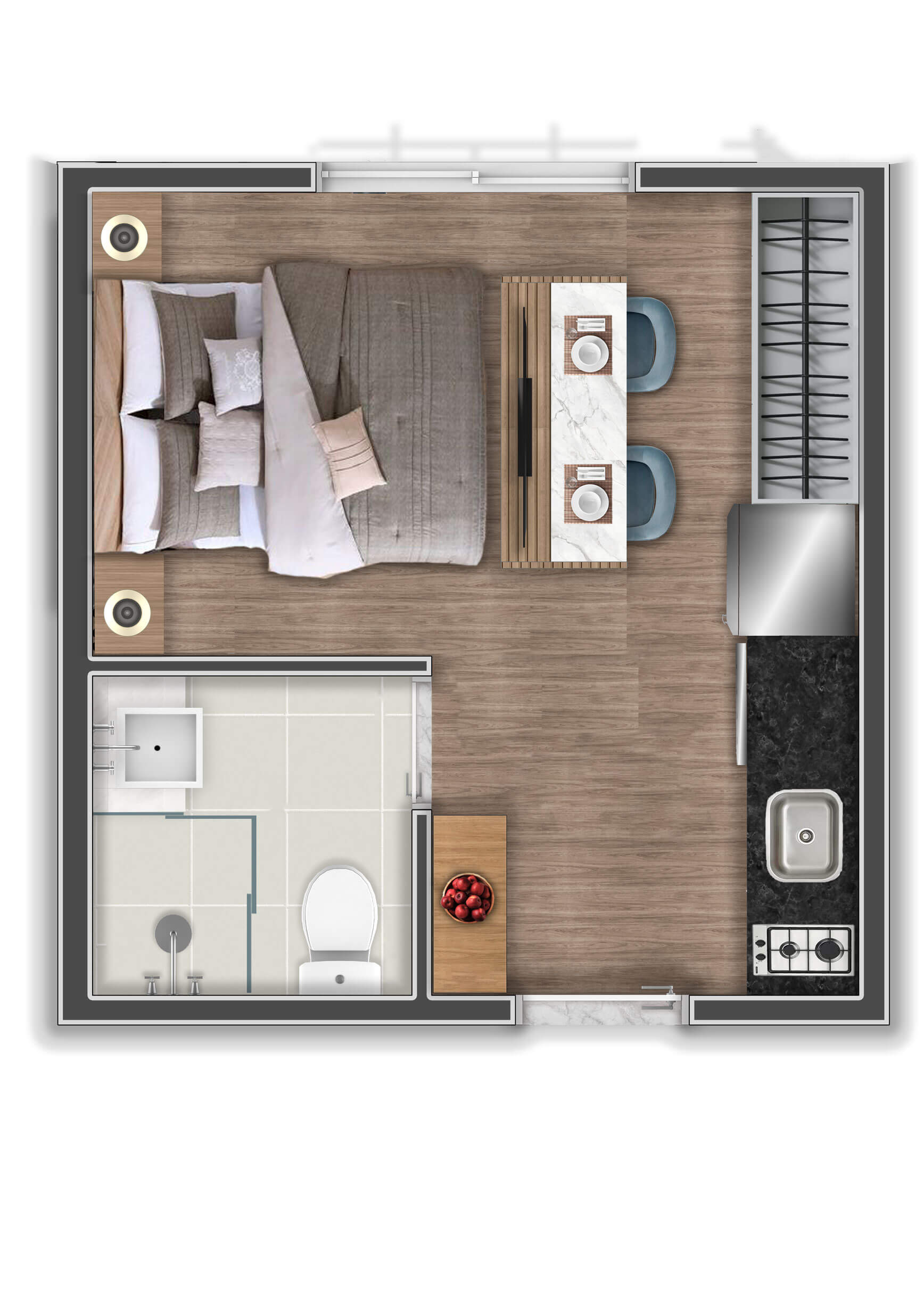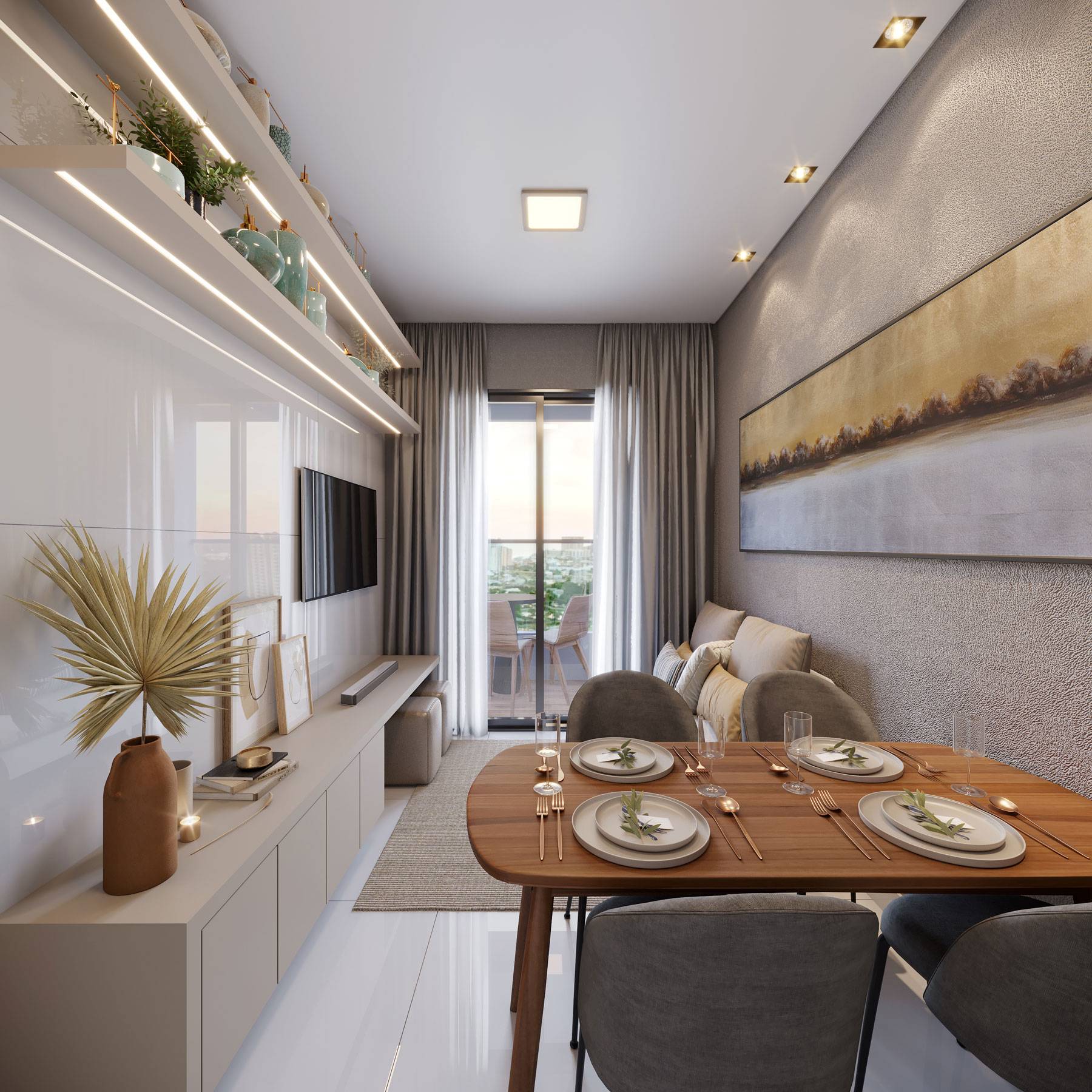A decoração é mera sugestão. Mobiliários, utensílios e equipamentos, não fazem parte do contrato de compra e venda. Acabamentos e revestimentos serão entregues conforme memorial descritivo , disponível em nossa central de vendas