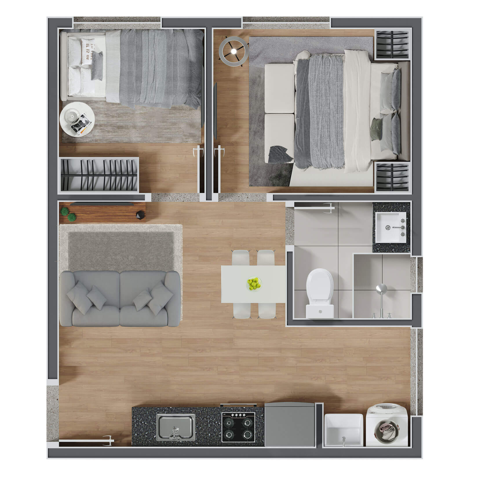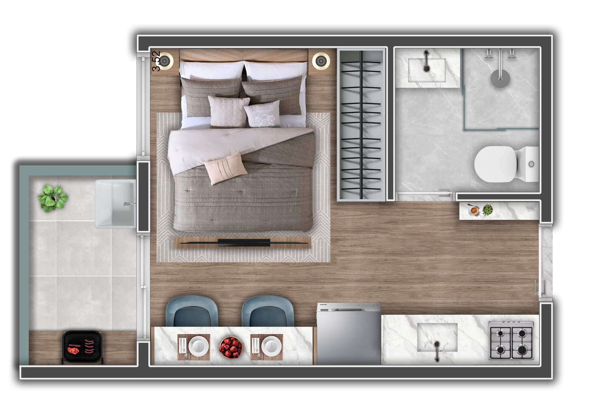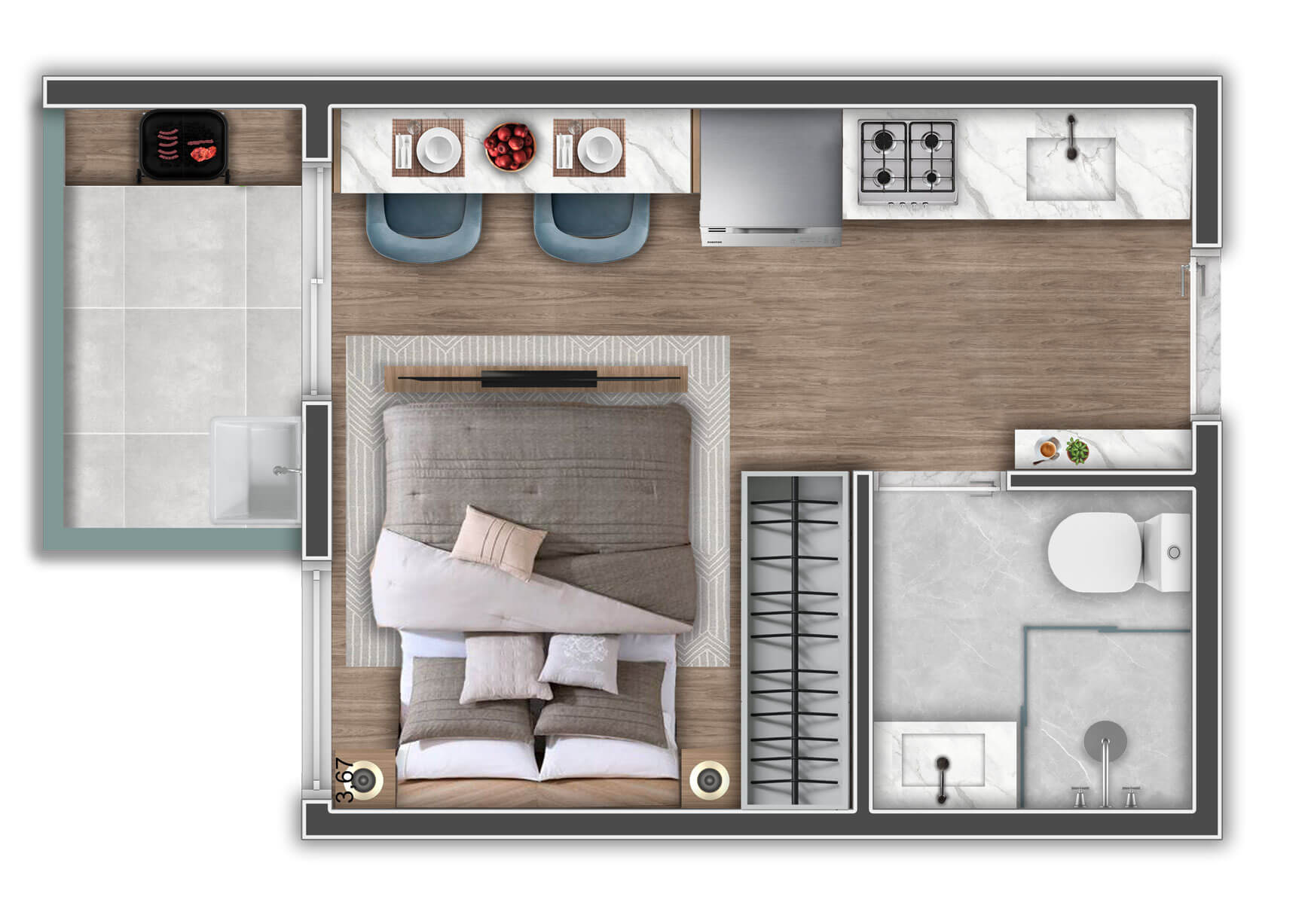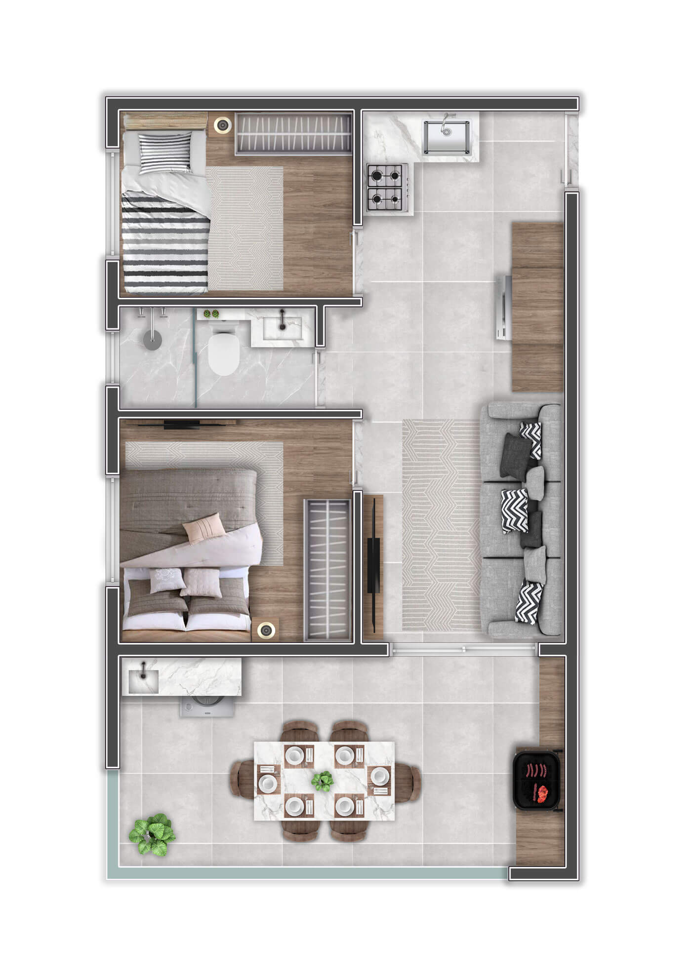A decoração é mera sugestão. Mobiliários, utensílios e equipamentos, não fazem parte do contrato de compra e venda. Acabamentos e revestimentos serão entregues conforme memorial descritivo , disponível em nossa central de vendas